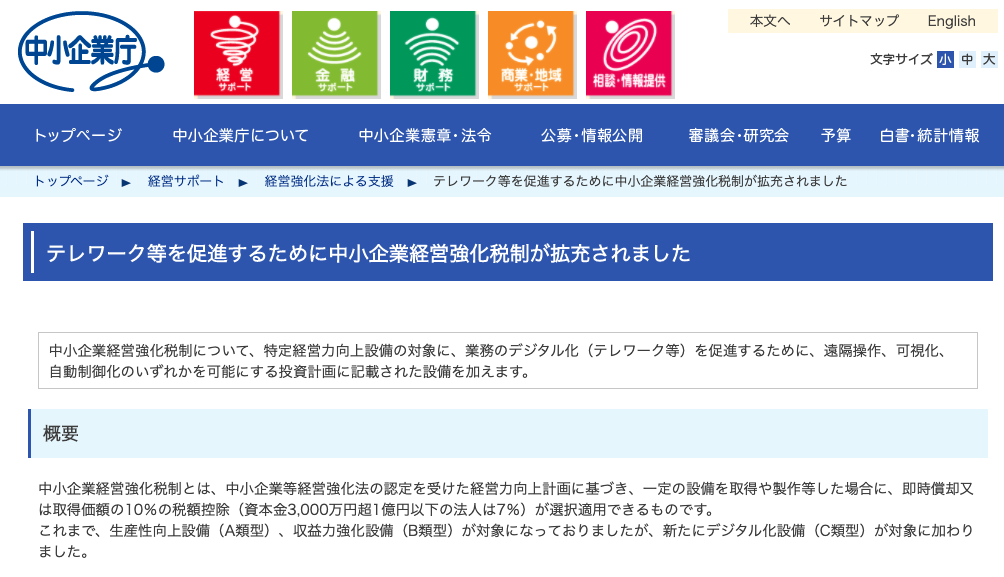 "中小企業経営強化税制とは、中小企業等経営強化法の認定を受けた経営力向上計画に基づき、一定の設備を取得や製作等した場合に、即時償却又は取得価額の10%の税額控除(資本金3,000万円超1億円以下の法人は7%)が選択適用できるものです。