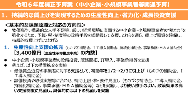 補助金・助成金 · 2024/12/24 2025年度に公募予定の補助金(速報) ものづくり補助金、IT導入補助金、持続化補助金、新事業進出促進補助金(2025年度) 各補助金の概要は補助金名をクリックして説明ページをご覧ください。 ■新事業進出補助金(新設) ■ものづくり補助金 ■IT導入補助金 ■持続化補助金 令和6年度補正予算の施策内容についてはこちらのTOPICSをご覧ください。 具体的に申請をお考えの方は問い合わせページにてご質問を記載の上でお送りください。 tagPlaceholderカテゴリ: