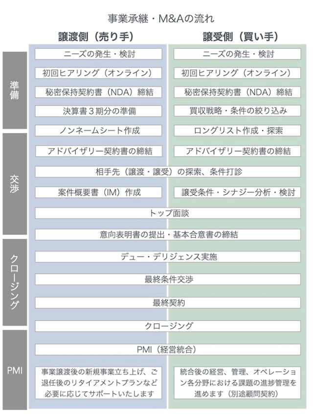 ・当社アドバイザリー業務:企業概要書作成、企業価値算定、候補先探索(ロングリスト&ショートリスト)、契約書作成、条件交渉、クロージング、PMIまで御社に伴走してご支援いたします。