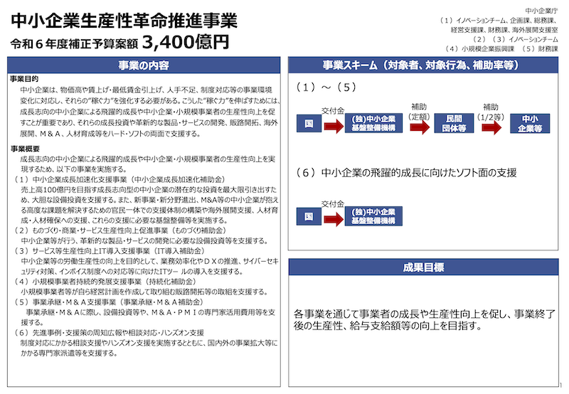 予算規模は3,400億円(生産性革命推進事業)の内数との記載があり、具体的には以下のとおりです。